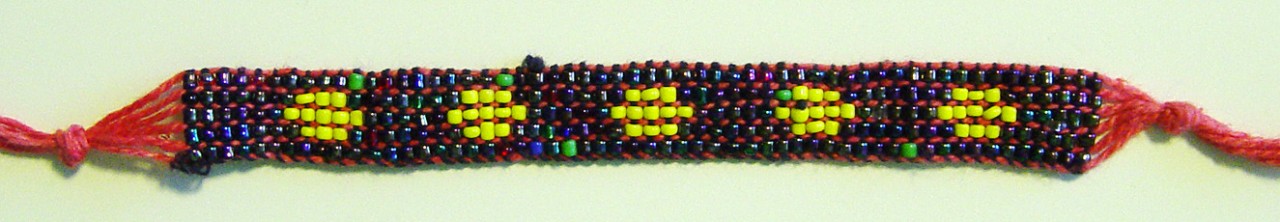 Náramek z barevných korálků a příze. Velikost univerzální díky nastavitelnému zavazování tkaničkou. Cena 29 Kč.
