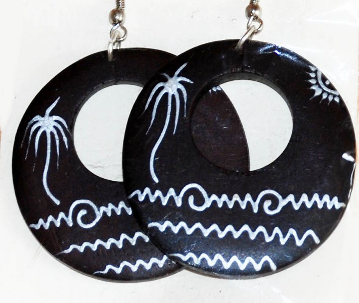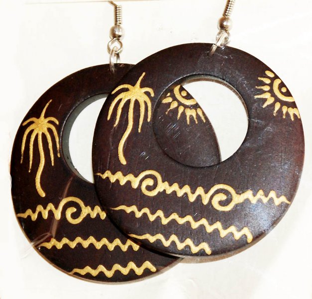 Náušnice z exotického dřeva ručně zdobené stylizovanými motivy palmy a moře. V barvě stříbrné nebo zlaté. Velikost náušnic 4,5 cm. Cena 69 Kč/pár náušnic. K dostání také jako set s náhrdelníkem.