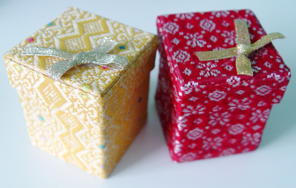 Látkové krabičky na vaše dárky. Velikost 5x5 cm, barvy červená, žlutá a zelená. Cena krabičky 29 Kč.