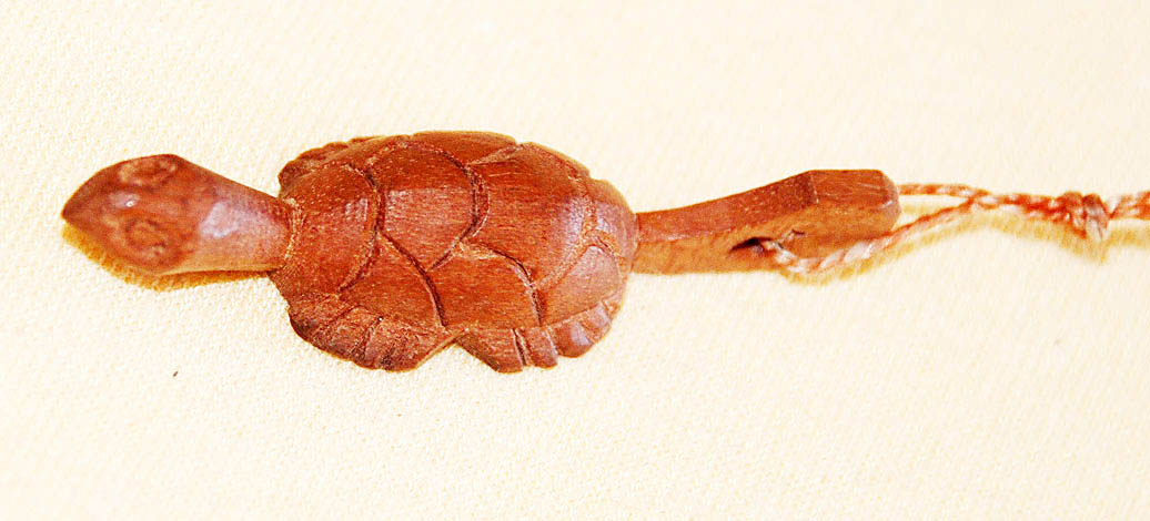 Dřevěný, ručně vyřezávaný přívěsek tvaru želvy. Velikost 4,5 cm. Cena 29 Kč.