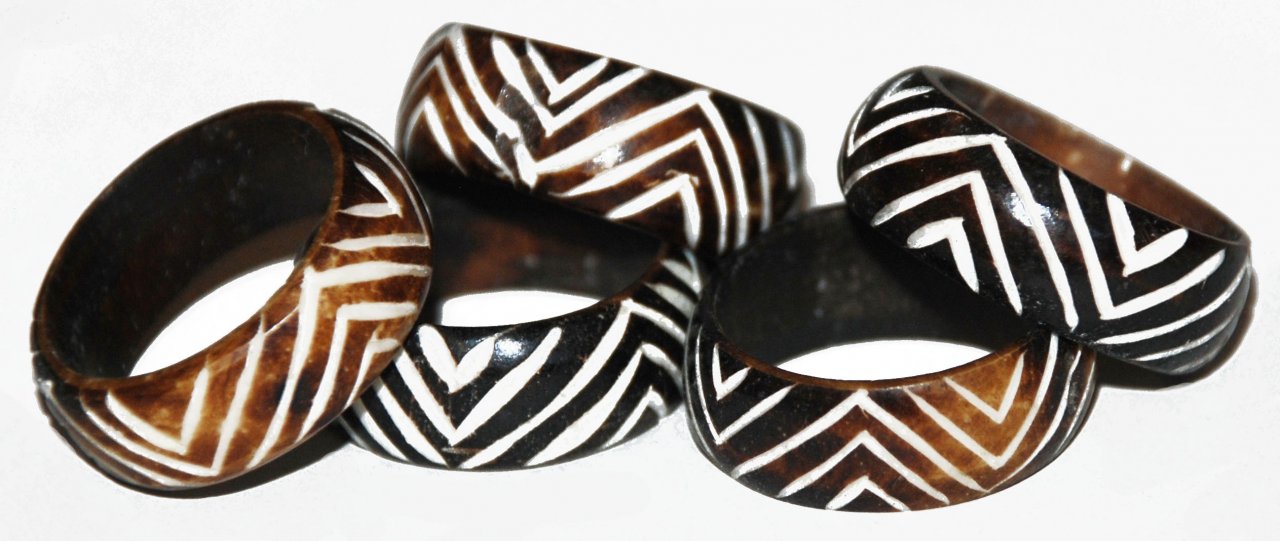 Prsten z bůvolího rohu s ručně vyřezávaným motivem bílých geometrických obrazců. Průměr 18 a 19 mm (velikost 56-59), výška 8 mm. Cena 59 Kč. Při koupi jakýchkoliv 3 prstenů cena 159 Kč.